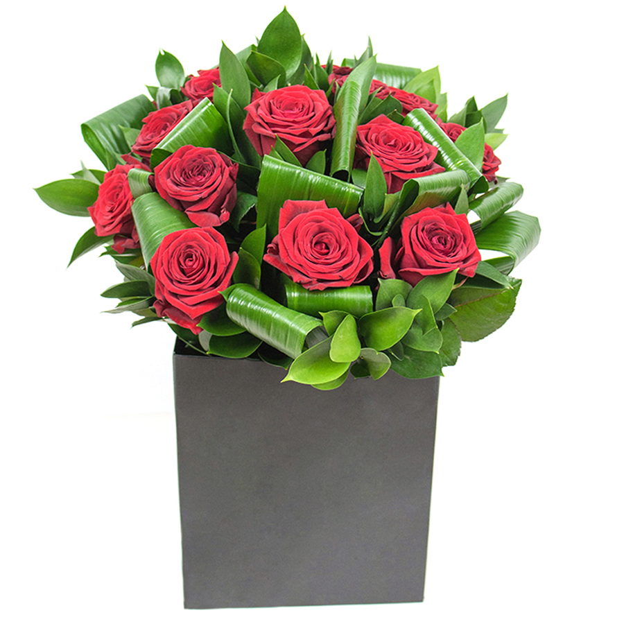 Immerse yourself in the timeless beauty of our stunning bouquet, artfully arranged with vibrant red roses, lush aspidistra leaves, and graceful ruscus. This unique combination brings sophistication and charm to any space.